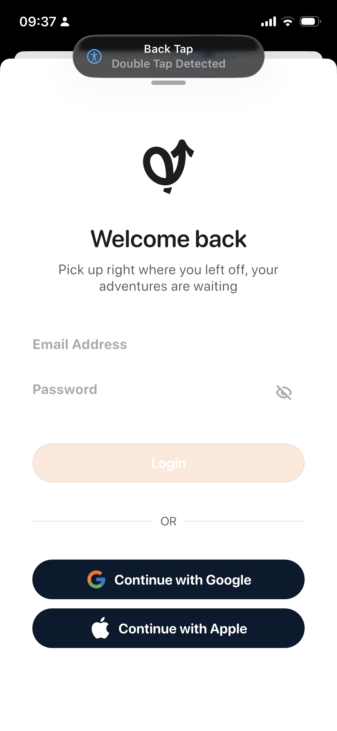 Email/password login + Google and Apple sign-in.